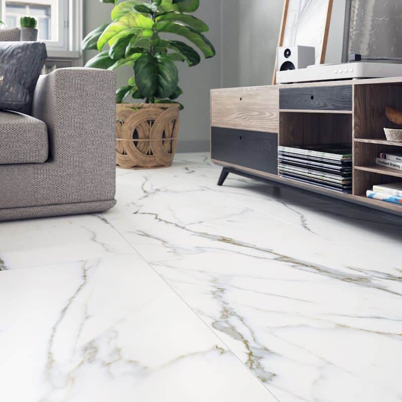 The epitome of luxury, these white marble-look polished floor tiles will elevate any home.